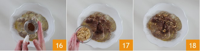 Colocar la carne en los platos y completar con una pizca de cacao amargo 16 y un puñado de granillo de nueces 17. Servir los escalopines al gorgonzola bien calientes 18.