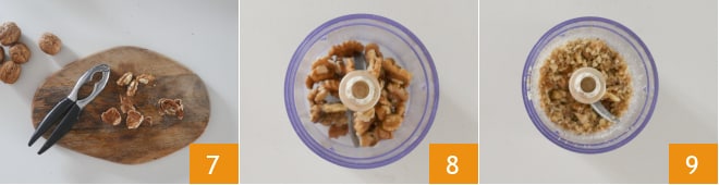 Cascar las nueces 7, colocar los granos en la batidora 8 y picar gruesamente 9.