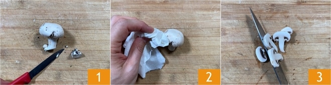 Para preparar los escalopines con setas cremosas, lo primero que deben hacer es eliminar la parte terrosa del tallo 1. Limpien las setas con un paño de papel húmedo 2, y luego corten en láminas los champiñones 3.