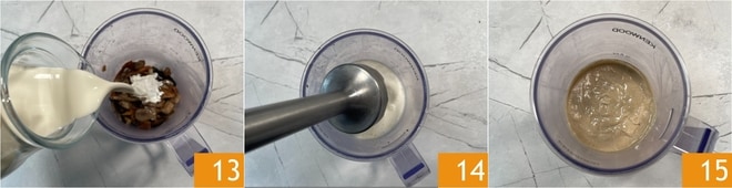Retiren el ajo, saquen la mitad de las setas y transfiéranlas a un vaso. Añadan la nata 13 y trituren con una batidora de mano 14 hasta obtener una crema homogénea 15. Reserven el resto de las setas.