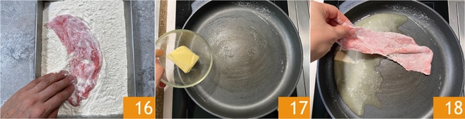 Ahora enharinen los filetes de ternera, previamente machacados con el mazo 16, y eliminen el exceso de harina. Derritan la mantequilla en la misma sartén donde cocinaron las setas 17, luego coloquen los filetes de carne enharinados 18.