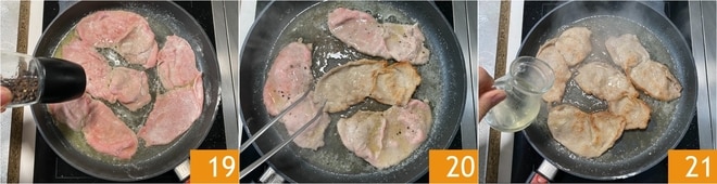Salen, pimentan 19 y doren a fuego medio durante 4 minutos, luego voltéenlas 20 y desglasen con vino blanco 21. Cocinen por el otro lado durante unos 3 minutos más, hasta que estén doradas. Una vez cocidas, reserven la carne cubierta con un papel de aluminio.