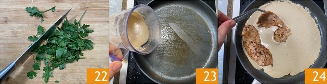 Piquen el perejil con el cuchillo 22. Siempre en la misma sartén, viertan la crema de setas 23, luego añadan la carne 24 y calienten a fuego bajo durante un minuto, sin remover.