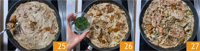 Finalmente, añadan las setas 25 y el perejil picado 26 y cocinen un minuto más. ¡Sus escalopines con setas cremosas están listos para ser servidos 27!