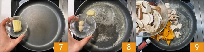 En una sartén, derritan la mantequilla 7, agreguen el ajo 8 y dejen que se impregne durante unos minutos. En este momento añadan las setas 9.