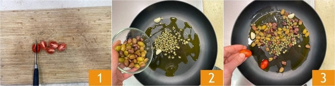 Para preparar los escalopines de pollo sabrosos, lo primero que hay que hacer es lavar los tomatitos y cortarlos por la mitad 1. En una sartén grande, añadir un poco de aceite, 2 dientes de ajo, las alcaparras y las aceitunas 2. Encender el fuego y colocar los tomatitos uno por uno con la parte cortada en contacto con la sartén 3.