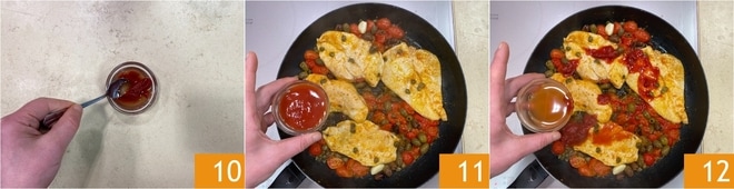 Mientras tanto, disolver el concentrado de tomate en un poco de agua 10. Añadirlo a la sartén 11 y agregar el agua restante para limpiar bien el cuenco 12.