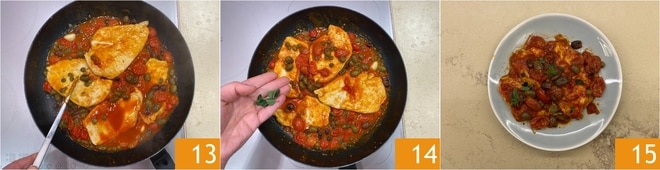 Mezclar bien 13 y cocinar durante un par de minutos más. En este punto, añadir las hojas de orégano fresco 14, solo una pizca de sal, pimienta y servir los escalopines bien calientes 15.