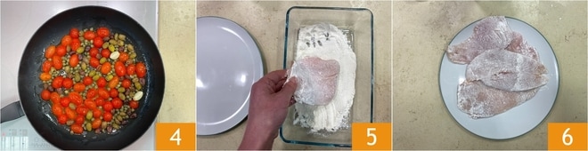 Dejar cocinar a fuego medio-alto durante unos 5 minutos 4. Mientras tanto, asegurarse de que los filetes de pollo sean finos, de lo contrario, aplastarlos con un mazo de carne. Enharinar los filetes de pechuga de pollo por todos los lados 5, sacudir el exceso y colocarlos en un plato 6.