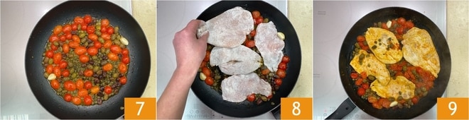 Cuando los tomatitos estén bien dorados 7, colocar en la sartén los filetes de pechuga de pollo 8. Dorar durante un par de minutos, luego darles la vuelta usando unas pinzas y dorarlos también del otro lado 9.