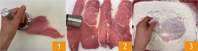 Para preparar los escalopines de ternera a la pizzaiola, lo primero que hay que hacer es golpear la carne para hacer las lonchas más tiernas y finas 1. Sazonar con sal y pimienta 2, luego enharinarlas ligeramente 3.