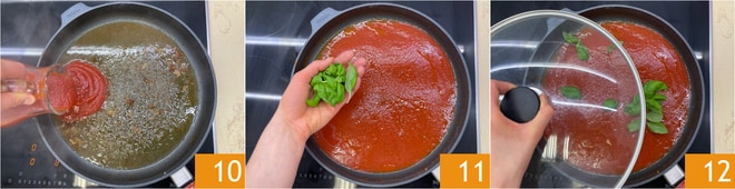 Verter en la sartén el puré de tomate 10, añadir la albahaca 11 y cubrir con una tapa 12. Dejar cocinar a fuego lento durante unos 10 minutos.