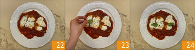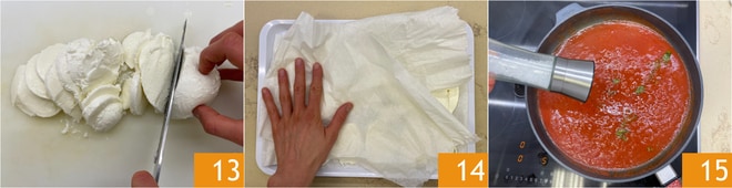 Mientras tanto, cortar la mozzarella en rodajas 13 y secarla bien con papel absorbente 14. Una vez que la salsa esté lista, ajustar de sal 15.