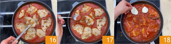 Colocar de nuevo en la sartén los escalopines 16, cubrirlos con la salsa 17 y distribuir las rodajas de mozzarella sobre la carne 18.