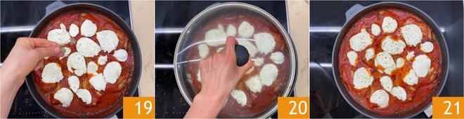 Añadir el orégano seco 19, cerrar con la tapa 20 y continuar la cocción por 2 minutos, justo el tiempo para que se derrita la mozzarella 21.
