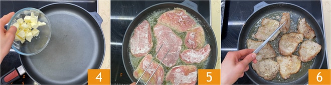 En una sartén caliente, derretir la mantequilla 4, luego añadir las lonchas 5 y dorarlas, a fuego medio, durante unos 2-3 minutos por lado 6.