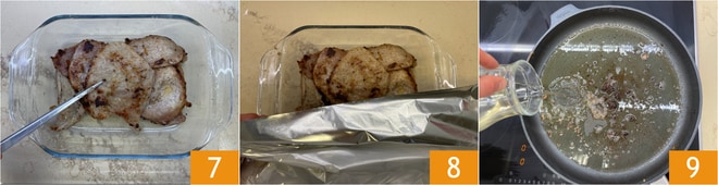 A medida que se cocinan, transferirlas a una fuente de horno 7 o a un plato y cubrir con una hoja de papel de aluminio 8. Mientras tanto, deglasar la sartén con vino blanco 9 y dejar evaporar toda la parte alcohólica.