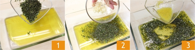 Para preparar el espada al papillote, comienza con la marinada: en un bol grande, vierte el aceite de oliva virgen extra y las hierbas aromáticas picadas 1, asegurándote de reservar una cucharada para añadir al papillote. Añade el ajo picado 2 y el jugo de medio limón junto con la ralladura del limón 3.