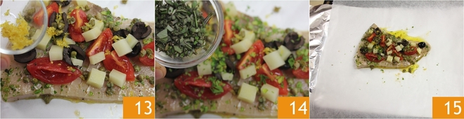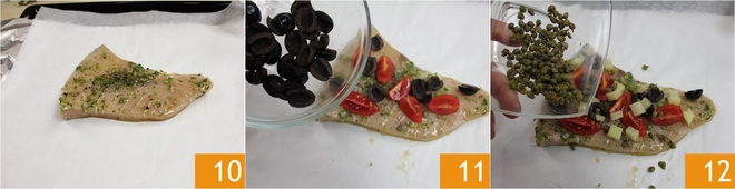 En una bandeja de horno, coloca todo lo necesario para el papillote: extiende una hoja de papel de aluminio, sobre ella una de papel de horno y en el centro coloca una de las dos rodajas de espada que habrás sacado de la marinada 10. Comienza a condimentar el pescado con las verduras cortadas, las aceitunas 11 y las alcaparras, lavadas y escurridas 12.