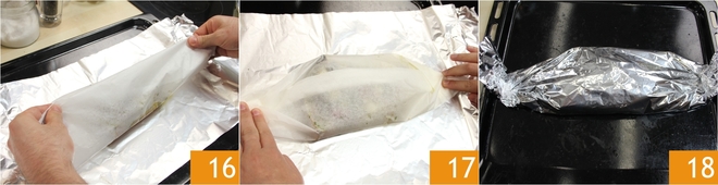 Enciende el horno a 200°, cierra los papillotes doblando primero el papel de horno en el centro 16 y doble los lados 17 y procediendo de la misma manera con la hoja de papel de aluminio 18. Cocina durante al menos 25 minutos, comprueba la cocción del pez espada (depende del grosor de tu rodaja, si es necesario déjalo en el horno otros 5 minutos) y luego sácalo del horno y colócalo en dos platos con su propio fondo de cocción!