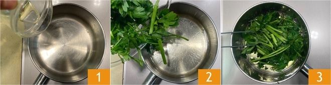 Para realizar los espaguetis con almejas con salsa de calabaza y mostaza de mandarina, empezad por la preparación del aceite de perejil: verted el aceite de semillas en un cazo 1 y calentadlo hasta una temperatura de 100°, luego añadid el perejil, que habréis lavado y secado previamente 2. Escaldad el perejil por unos minutos, removiendo continuamente 3.