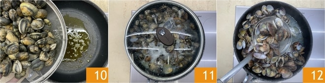 Tan pronto como el ajo suba a la superficie, añadid las almejas 10, cubrid con una tapa (mejor si es de vidrio) 11 y cocinad a fuego medio hasta que se abran todas. En este punto, retirad las almejas con una espumadera 12 para separarlas de su líquido de cocción.