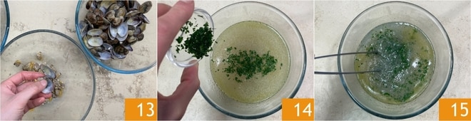 Descochad las almejas y reservadlas en un bol 13. Verted el líquido de cocción en otro bol, teniendo cuidado de dejar posibles restos en la sartén, luego añadid el perejil picado 14, mezclad y reservad 15.