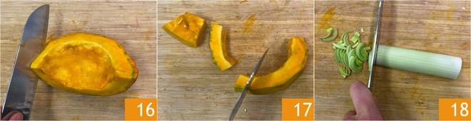 Pasad a la salsa de calabaza: pelad la calabaza 16 y cortad 200 g de pulpa en dados 17, luego limpiad el puerro y cortad finamente la parte blanca 18.