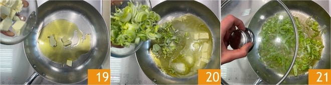 En una sartén, derretid suavemente la mantequilla con el aceite 19, luego añadid el puerro 20. Bajad el fuego, cubrid con la tapa y estofad suavemente el puerro durante unos minutos 21.