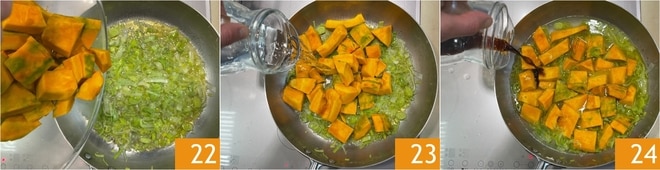 En este punto, añadid la calabaza 22, luego verted el agua 23 y la salsa de soja 24. Cubrid con la tapa y cocinad durante 20 minutos.