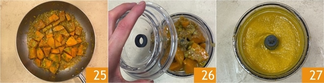 Cuando la calabaza esté cocida, el peso del contenido de la sartén deberá ser de 450 g 25. Transferid todo a una batidora 26 y batid hasta obtener una consistencia lisa y homogénea 27. Ajustad la salsa de calabaza con sal y reservad.