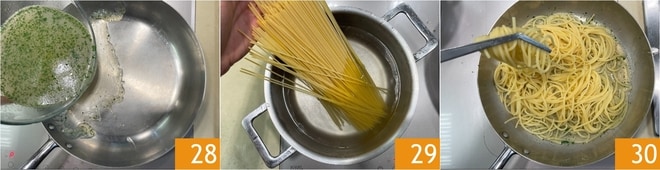 Llevad a ebullición una olla con agua salada y verted una parte del líquido de cocción de las almejas en una sartén 28. Mientras tanto, calentad agua sin sal en otro cazo. Cocinad los espaguetis durante 5 minutos 29, luego pasadlos a la sartén 30.