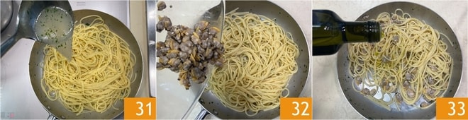 Llevad a cocción los espaguetis alternando el líquido de las almejas con el agua sin sal, un cazo a la vez 31. Probad de vez en cuando para verificar la salinidad y ajustaros en consecuencia sobre cuál líquido añadir. Terminad de risottar la pasta añadiendo también un chorrito de aceite. Cuando hayáis obtenido una bonita cremita, saltead los espaguetis fuera del fuego y añadid las almejas descascaradas 32. Añadid aún un cacito de líquido y un chorrito de aceite 33 y saltead nuevamente todo para amalgamar, siempre con el fuego apagado.