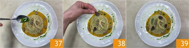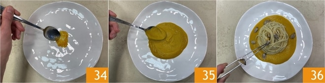Estáis listos para emplatar: extendid la mostaza de mandarinas en la base 34, luego cubrid con la salsa de calabaza 35 y colocad encima un nido de espaguetis con almejas 36.