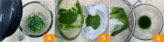Batid todo durante 30 segundos 4, luego verted el puré obtenido en un colador forrado con papel absorbente que habréis puesto sobre un bol 5. Dejad escurrir en el frigorífico, incluso toda la noche: de esta manera, el agua de vegetación se depositará en el fondo del bol mientras el aceite de perejil goteará poco a poco, quedando flotando 6. Al final de la receta necesitaréis tanto el aceite como la pasta de perejil que quede en el papel absorbente.