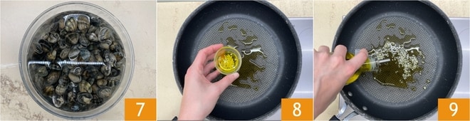 Cuando el aceite de perejil esté casi listo, podéis dedicaros a las almejas: dejadlas en remojo con un litro de agua y 25 g de sal durante una hora 7. Pasado este tiempo, golpeadlas en un bol y verificad que no haya restos de arena; en caso contrario, proceded nuevamente con el remojo. Transcurrido este tiempo, comenzad a dorar suavemente el ajo picado con un chorrito de aceite en una sartén 8, luego verted otros 100 g de aceite de oliva virgen extra 9.