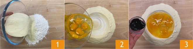 Para preparar los espaguetis a la guitarra con tinta de sepia, mejillones y gambas, lo primero es ocuparse de la pasta fresca: en una superficie de trabajo mezcla harina 00 y sémola 1. Forma el clásico volcán y vierte en el centro los huevos y la yema 2. Añade una pizca de sal y la tinta de sepia 3.