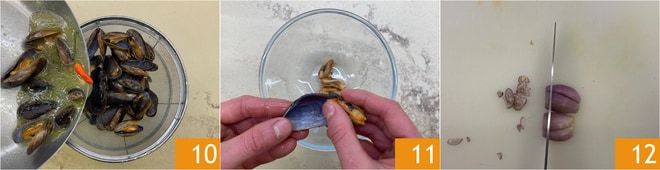 Una vez abiertos, filtra 10 y conserva el líquido de cocción. Elimina las conchas y reserva 11. Limpia la chalota y córtala finamente 12.
