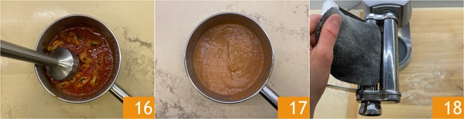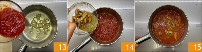 En una cacerola vierte un chorrito de aceite, añade la chalota y rehógala durante unos minutos. Vierte la pulpa de tomate 13 y cocina durante 15 minutos. Luego añade la mitad de los mejillones 14 y deja que se impregnen de sabor durante unos minutos 15.