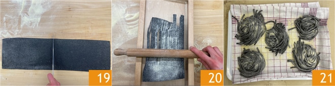 Corta las láminas en rectángulos más pequeños 19 y colócalos en la guitarra, luego córtalos pasando el rodillo por encima 20. Coloca los espaguetis a la guitarra en un paño limpio y enharinado con sémola 21.