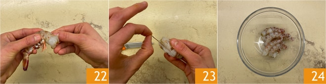 Mientras tanto, limpia las gambas: elimina la cabeza, el caparazón 22 y el intestino 23, luego recoge la carne en un bol 24.