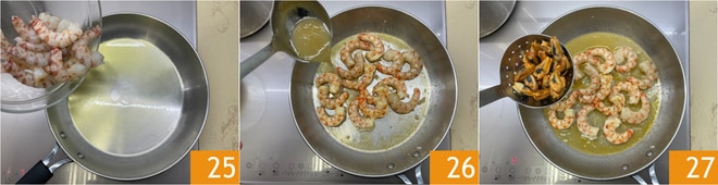 En una sartén vierte un chorrito de aceite, añade las gambas 25 y saltéalas durante unos minutos, luego desglasa con el agua de cocción de los mejillones 26. Añade también los mejillones restantes 27 y cocina durante unos minutos, el tiempo justo para que los ingredientes se mezclen.
