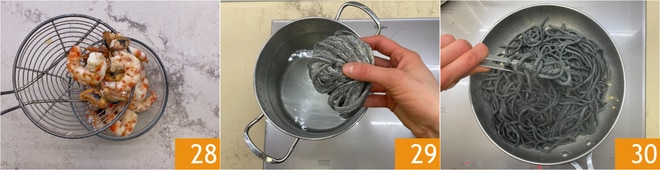 Transfiere los mejillones y las gambas a un bol 28 y deja el líquido de cocción en la sartén, lo necesitarás más tarde. Cocina los espaguetis en abundante agua hirviendo con sal 29, escúrrelos y transfiérelos a la sartén donde cocinaste los mejillones y las gambas 30.