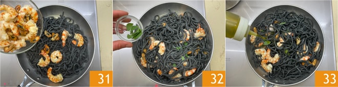 Añade mejillones y gambas 31, algunas hojas de mejorana fresca 32 y mezcla con un chorrito de aceite 33.
