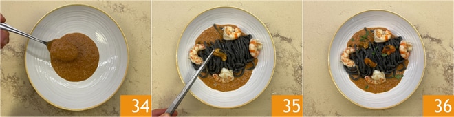 Coloca en el fondo del plato la crema de mejillones 34, dispón los espaguetis en forma de nido extendido y completa con gambas, mejillones 35 y algunas hojas de mejorana. Los espaguetis a la guitarra con tinta de sepia, mejillones y gambas están listos para servir 36!