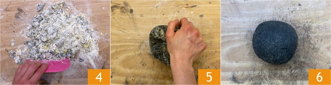 Mezcla el compuesto primero con una espátula 4 y luego continúa trabajando con las manos 5 hasta obtener una masa lisa y homogénea 6. Envuélvela en film transparente y deja reposar durante 30 minutos en el frigorífico.