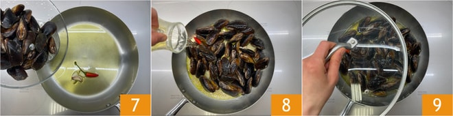 En una sartén vierte un chorrito de aceite, añade el chile, el ajo y los mejillones 7. Desglasa con el vino blanco 8 y tapa con la tapadera 9, luego cocina hasta que se abran.