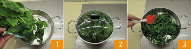 Para preparar los espaguetis a la guitarra verdes con queso y pimienta, comenzad con la masa: en una sartén poned las espinacas lavadas 1, cubrid con una tapa 2 y dejad que se marchiten durante unos 5 minutos, o el tiempo necesario para ablandarlas 3.