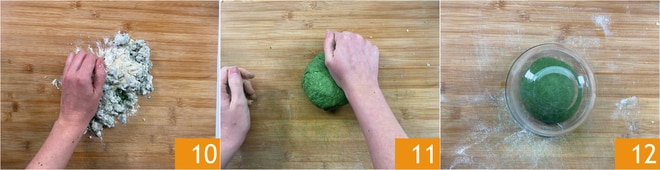 Pasad la masa a una superficie de trabajo 10 y trabajadla enérgicamente durante unos 10 minutos 11 hasta obtener una masa homogénea y lisa. Formad una bola, cubridla con el bol y dejad reposar durante 30 minutos 12.