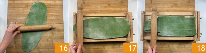 Debéis obtener una hoja rectangular con un espesor de 2 mm 16. Tratad de realizar un rectángulo que tenga las dimensiones de vuestra guitarra. Ahora levantad la masa enrollándola en el rodillo y desenrolladla sobre la guitarra 17. Pasad el rodillo sobre la masa ejerciendo una presión firme para cortar la hoja con las cuerdas y así obtener los típicos espaguetis 18. Continuad de esta manera con el resto de la masa.